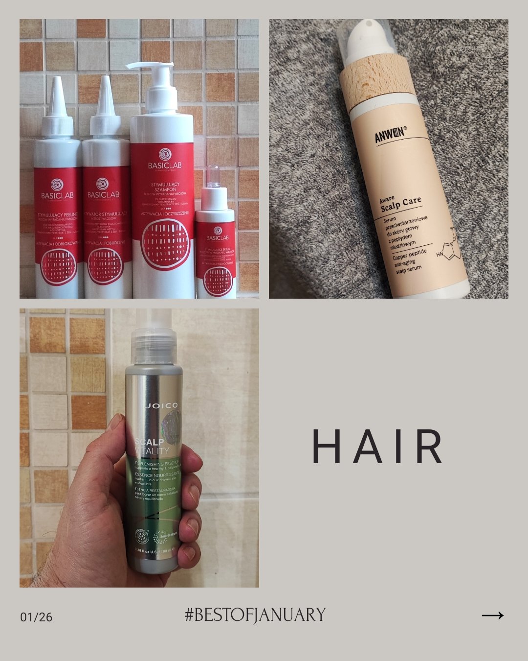 Nowej, stymulującej serii do włosów BasicLab używam już od ubiegłego roku. Mogę więc rzetelnie ją ocenić. Nie zmagałem się z jakąś dramatyczną utratą włosów, ale stosowanie tych kosmetyków zdecydowanie je wzmocniło, a w wannie nie znajduję już zupełnie nic po myciu. Na co dzień stosuję szampon i serum. Raz na tydzień peeling i stymulator. Używając tego ostatniego trzeba być przygotowanym na działanie rozgrzewające i możliwość zaczerwienienia skóry. Pierwszy raz się wystraszyłem, ale nie ma czego, bo efekt po czasie znika. We wszystkich kosmetykach znajdziemy witaminę B6, niacynamid i chyba najciekawszy składnik czyli fermentowany ekstrakt z żeńszenia. Serum stymulujące BasicLab stosuje wymiennie z dwoma innymi produktami do scalpu. Pewnie nie raz już wspomniałem, że mam na punkcie jego pielęgnacji małego hopla. Gdy potrzebuję odświeżenia i dobrego nawilżenia sięgam po Scalp Vitality Replenishing Essence marki Joico w postaci lekkiej mgiełki. Formuła jest tak lekka, że jak już w końcu przyjdzie wiosna i lata zamierzam ją stosować nawet w ciągu dnia dla odświeżenia głowy. W postaci nocnej kuracji stosuję natomiast serum przeciwstarzeniowe do skóry głowy marki Anwen. Bohaterem tego specyfiku jest tripeptyd miedzi, który stymuluje naprawę i przebudowę skóry. Są tu też aktywne fermenty, kwas hialuronowy, roślinny kolagen i organiczna esencja ze skórek mandarynek, która zwiększa ilość melaniny w mieszkach włosowych, tak istotnej w procesie siwienia włosów. Nie powiem, ten ostatni argument był dla mnie najbardziej przekonujący. Serum ma formułę lekkiego przeźroczystego żelu.