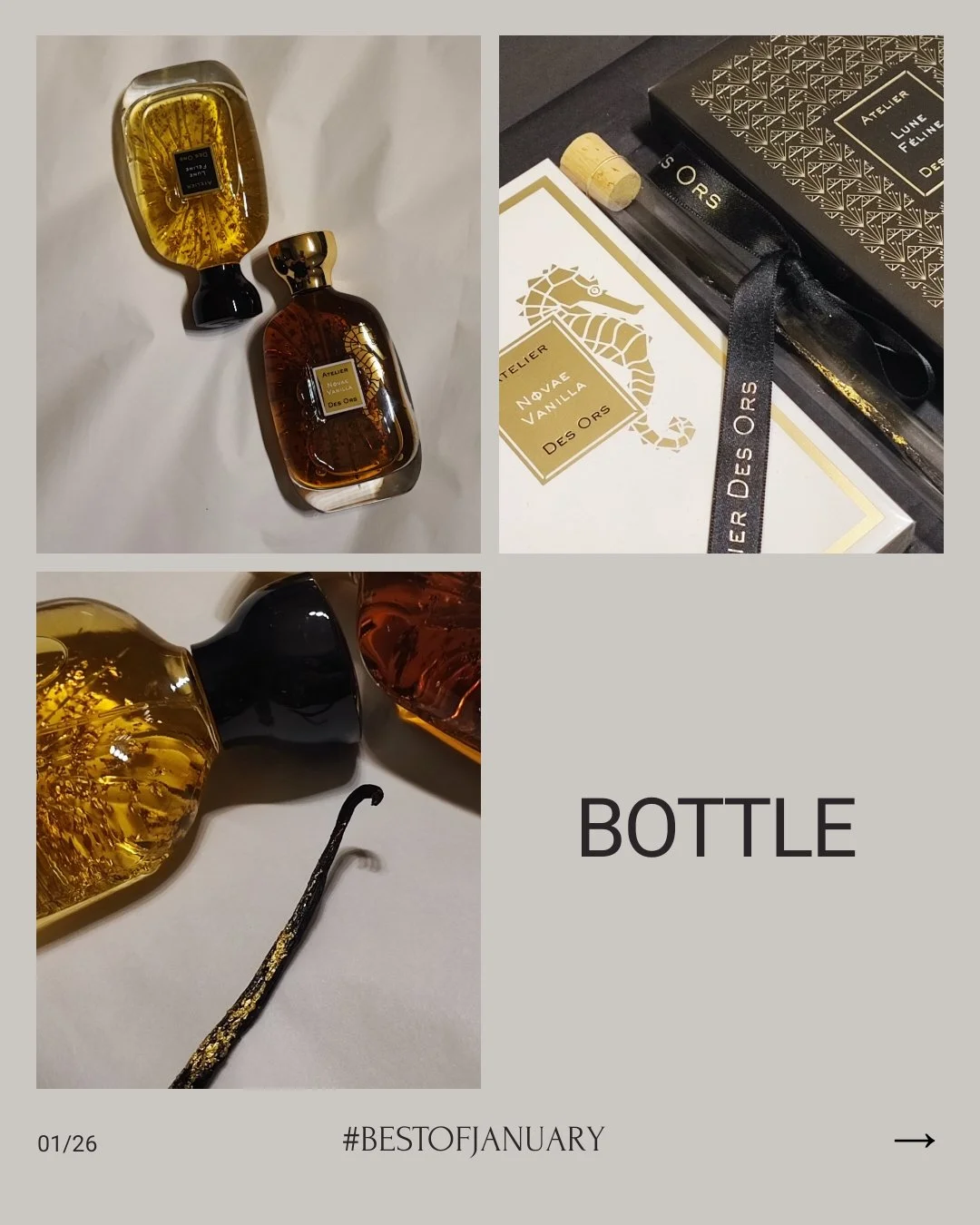 W styczniu otrzymałem od marki Atelier des Ors przepiękny kofret zawierający dwa mieniące się złotem pachnidła. Wyszedł on dla uczczenia 10 lecia marki, które spięto w waniliową klamrę. W 2016 światło dzienne ujrzał niezwykły waniliowy zapach Lune Feline. Wszedł w skład premierowej szóstki i do dziś pozostaje bestsellerem. Lune Feline to ciemna strona wanilii uwydatniająca jej ambrowe, balsamiczne i korzenne aspekty. W kontraście do tej kompozycji powstała niedawno Novae Vanilla, na której premierze miałem przyjemność być w Perfumerii Quality w grudniu. To wanilia świetlista, słoneczna, upiększona mimozą. Zapachy na dwa różne nastroje, na dwie różne okazje i może pory roku, ale przepięknie się uzupełniające. Póki mój perfumeryjny detoks trwa cieszę oko widokiem ich flakonów. A te zdecydowanie należą do jednych z moich ulubionych. Uwielbiam wprawiać ten złoty pył w ruch. Tak niewiele trzeba by zadziała się magia…