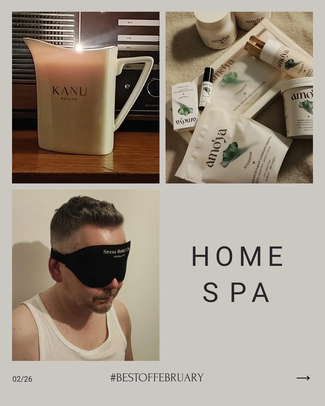 Przeczytałem gdzieś, że zima to nie jest pora działania, a ten kto wymyślił postanowienia noworoczne powinien być wtrącony do lochu. No cóż taki jest nasz naturalny rytm i ja się mu w tym roku wybitnie poddałem. Działałem mniej, rozkoszowałem się nicnierobieniem, a wspierały mnie w tym ciemność, dotyk i wyselekcjonowane zapachy sprzyjające relaksowi. Amo’ya to marka kosmetyków i akcesoriów do ciała i kąpieli dostępna w sieci Rossmann. Byłem miło zaskoczony jak doskonale zadziałała na mnie ich linia Wyciszenie (a jeszcze bardziej jak mało to kosztuje!). Otrzymałem całkiem spory zestaw: peeling i masło do ciała, sól do kąpieli, palo santo do palenia, roll-on z wyciszającym zapachem i maskę na oczy. Ta ostatnia to prawdziwy hit! Wykonana z miękkiego lnu i wypełniona lawendą poduszka doskonale relaksuje zmysły, a jej ciężar uspokaja zmęczone codzienną gonitwą oczy. W ogóle polubiłem zimą stosowanie masek na oczy. Gdy potrzebowałem szybkiej turbo drzemki w ciągu dnia wskakiwałem w nową maskę Unplug! marki Kovalite. Jest wyjątkowo miękka i zapewnia całkowite odcięcie od bodźców świetlnych. Widzę już dla niej zastosowanie wiosną i latem! Gdy będę chciał dłużej pospać rano, zastąpi mi żaluzje! Masowaliście się już kiedyś świecą? Ja to bardzo lubię! Doświadczenie łączy w sobie oddziaływanie ciepłem, zapachem i dotykiem nie mówiąc już o korzyściach pielęgnacyjnych dla skóry. W lutym używałem świecy do masażu marki Kanu o zapachu Mango. Skomponowano ją z masła shea, masła kakaowego i olejów migdałowego i z awokado. Topi się i rozgrzewa do odpowiedniej temperatury, która zapewnia optymalną przyjemność masażu. Naczynie w którym ją umieszczono posiada dzióbek ułatwiający wylewanie wosku. Nie potrzeba go wiele, jest bardzo wydajny, a zarazem szybko wchłania się w skórę. Warto też mieć pod ręką parę przyjaznych rąk, które pomogą w osiągnięciu relaksu. Ja miałem to szczęście.